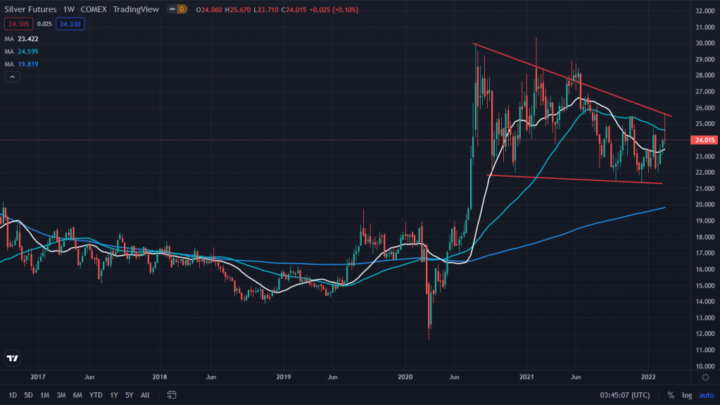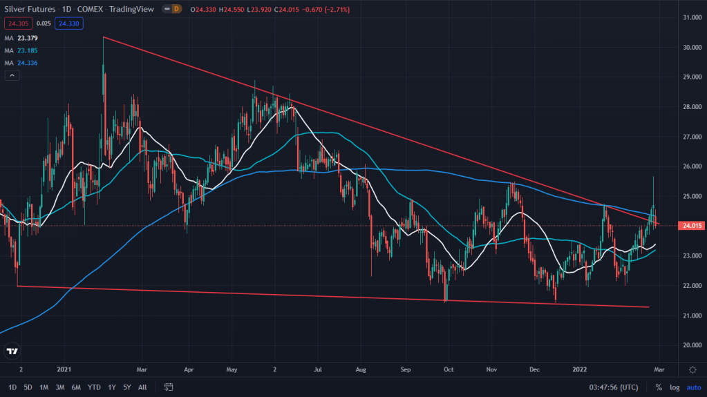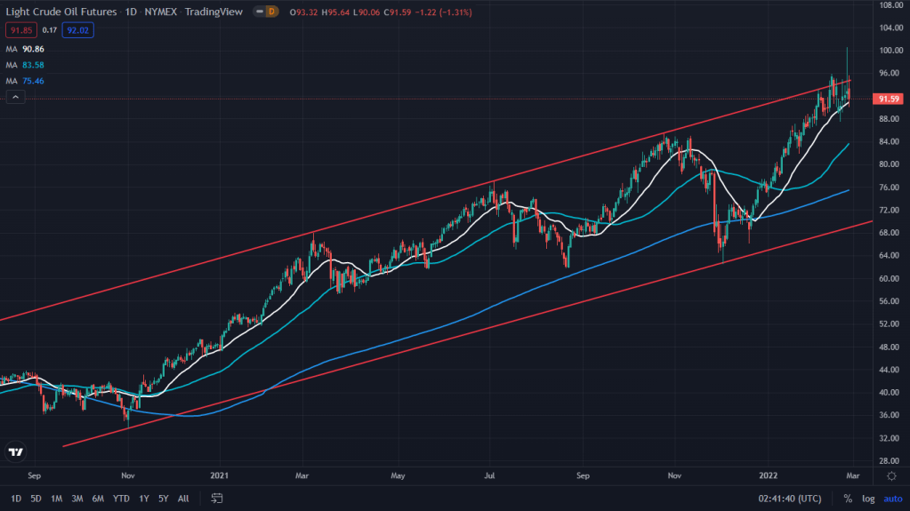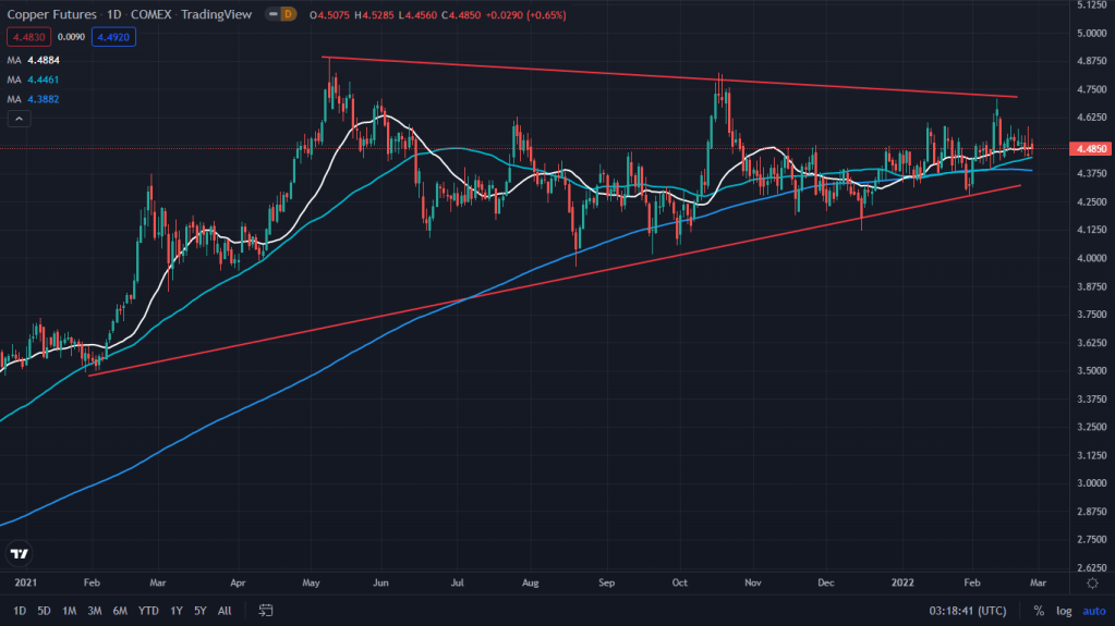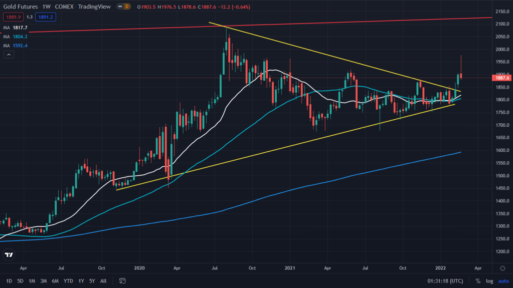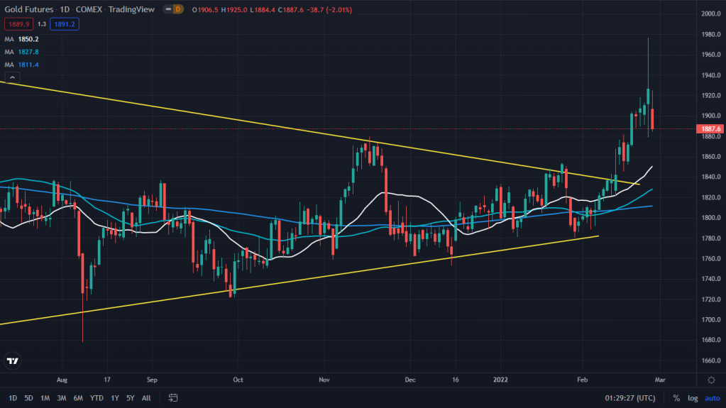 Gold: While the moves in the prices of Gold have been signalling a breakout, the fall from the highs on Friday could easily be termed as move towards backtest. But given the faster development of geopolitical situation with regards to Ukraine and Russia, it’s a sign of uncertainty and that’s sign of bullishness for gold which is a safe heaven in uncertain times. From technical point of view, 1875 and 1850 are the two key levels where the shiny metal would bounce back from its key support on the daily chart as shown below.
