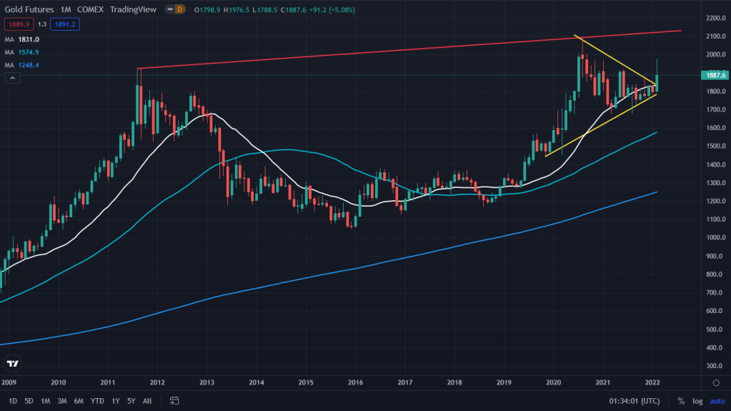 Weekly: The weekly chart clearly shows the breakout from a multi-week consolidation and headed towards 2100-2130 zone in the next few weeks. And please note, that’s the bare minimum for the gold. As the next chart on the monthly time frame shows.