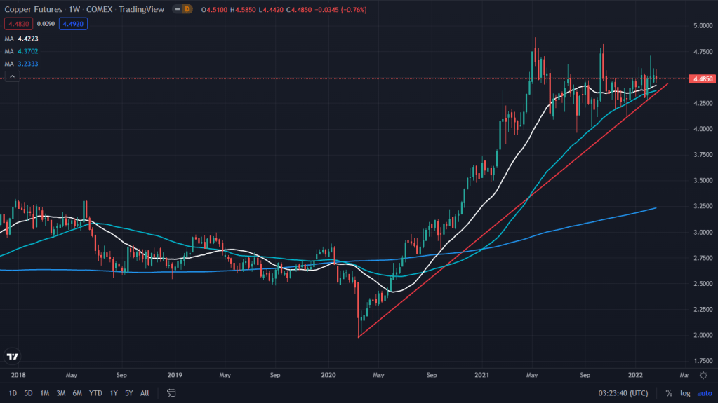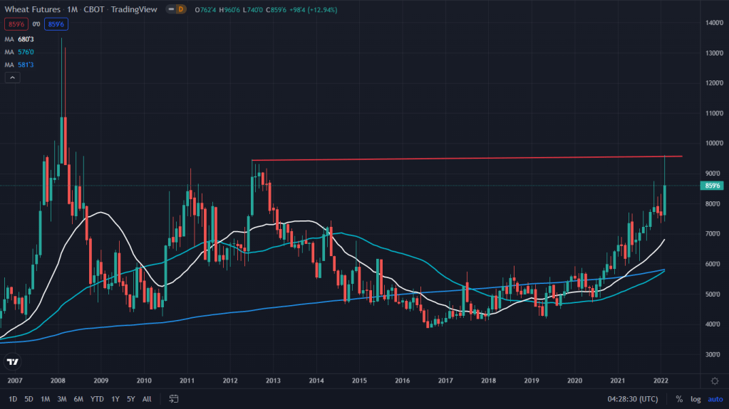 Wheat futures: Yet another commodity affected by the Ukraine crisis and could be staring at yet another potential C&H breakout, although the pattern is yet to complete.