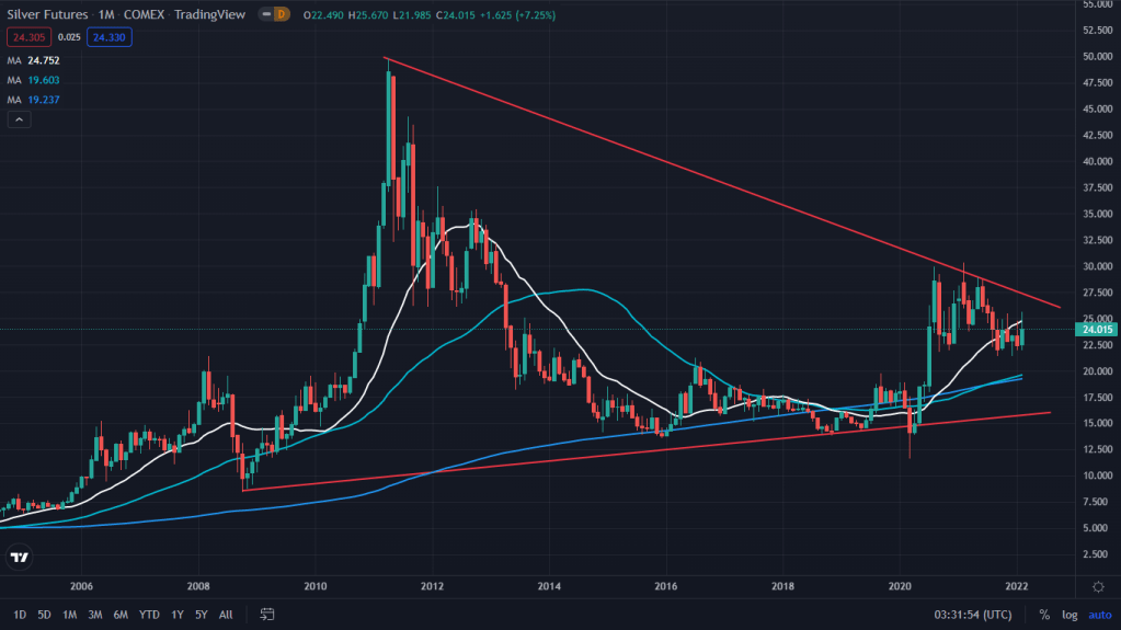 Silver: While the white precious metal usually follows what the yellow one does, but here it’s not exactly a similar pattern but a bit different as in there is a breakout on the weekly and daily off a triangle pattern, the monthly chart isn’t a C&H formation but another triangle there too and the breakout point is at 26 on the monthly chart.