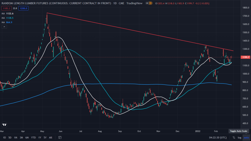 Lumber: While lumber was most talked about last year, nobody remembered it again when it almost hit the year ago price. Probably they would talk again when the prices actually cross past he highs again and beyond as this daily chart shows the breakout of C&H is on the horizon.