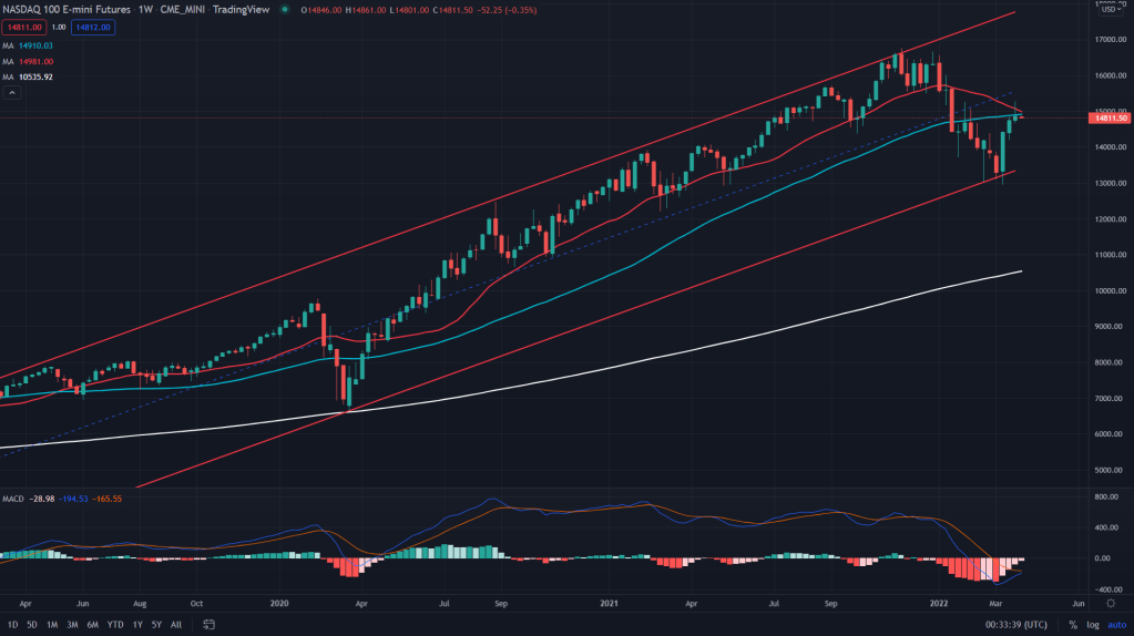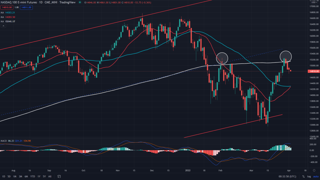 NQ (Nasdaq 100 futures): Bears have it in control. Non-sustenance of 20-50 weekly SMAs, non sustenance of 200 DMA on the daily and double top reversal.