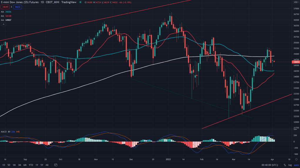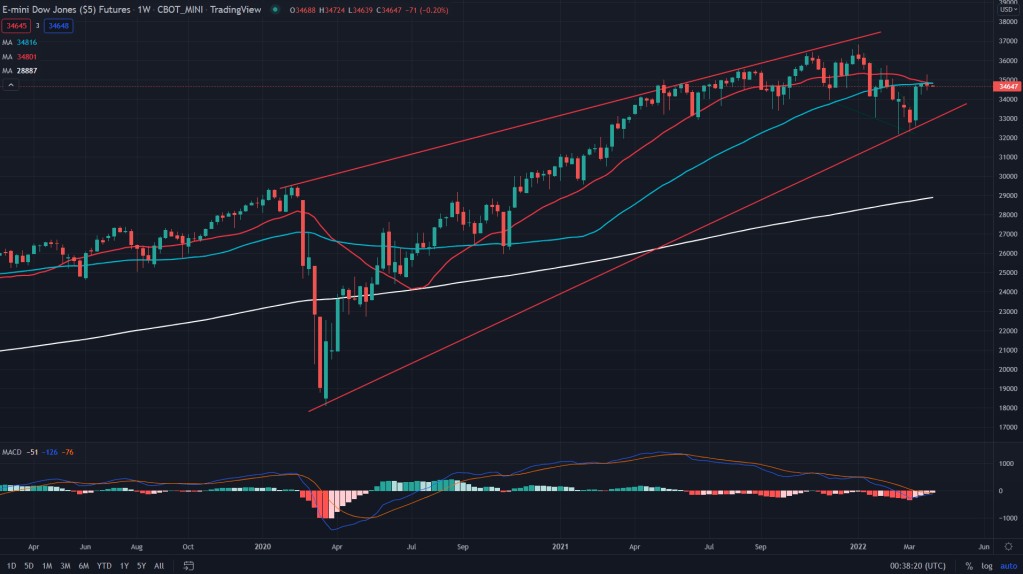 YM (E-mini Dow Jones futures): Another key futures and another bearish close on the weekly charts similar to the NQ – weekly close below 20 and 50 SMAs. What would be more bearish is the formation of rising wedge on the weekly which is on the verge of breakdown on the resumption of this downtrend.