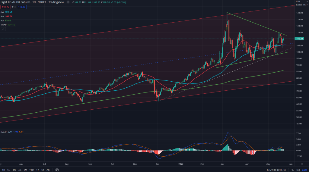 Zoom in further and we see consolidation in the form of triangle formation. Which way would it break would be a flip of the coin, but given geopolitical situation around, I would like to lean bullish for a retest of the channel resistance on the weekly. Probably 130-140 is where one should find new levels to come into play.