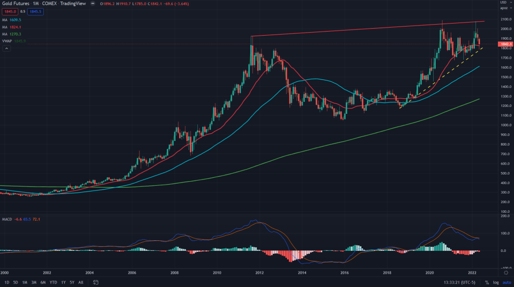 Zooming into weekly chart and another beautiful ascending triangle is in play. One would want to buy gold at current prices with keeping an eye for the breakout anove recent highs (2078) and stops placed below last week’s lows (1785).