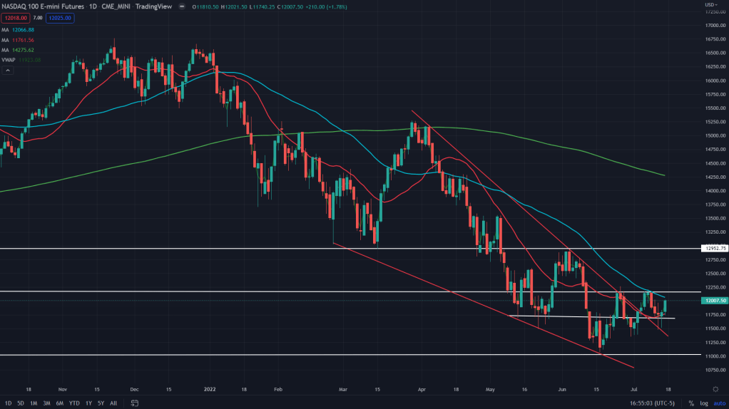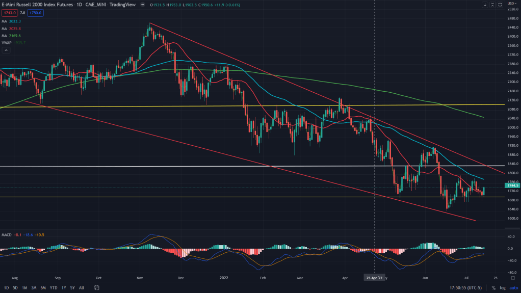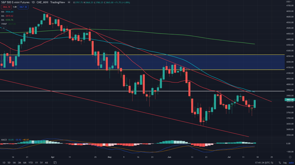 Here’s the daily chart of NQ futures. While I had already mentioned on my Twitter feed (here, here and here), there was a falling wedge breakdown that broke out, backtested and rallied back up. We traded the breakout and the rally after the backtest as well.