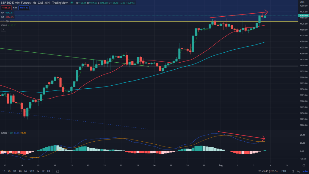ES (4H): When we zoome in and look at the 4H chart, we can see momentum fading away as the negative divergence takes shape as depicted in the chart below. I would expect ES to give up some gains towards 4080/4040 levels befire resuming the uptrend.