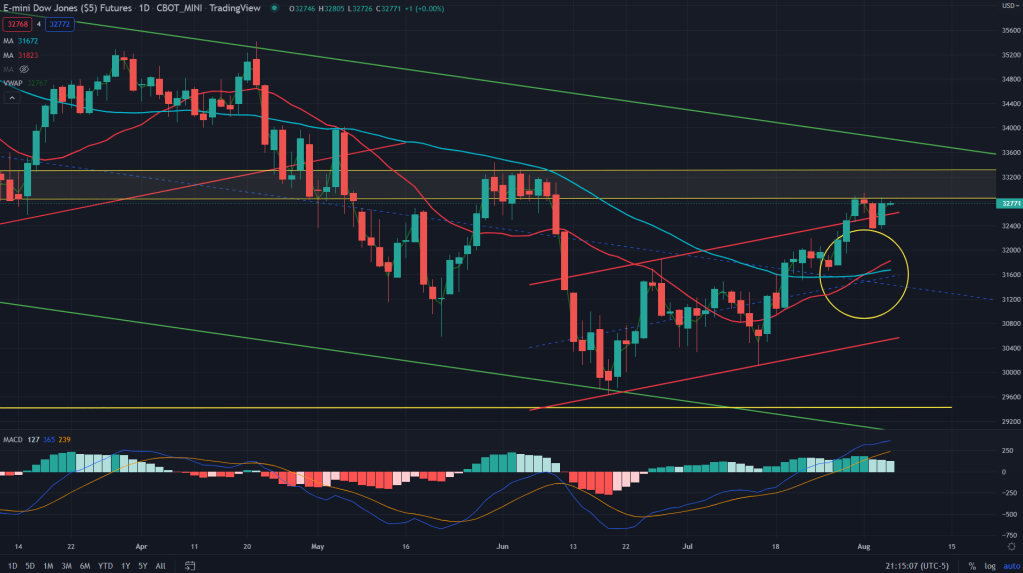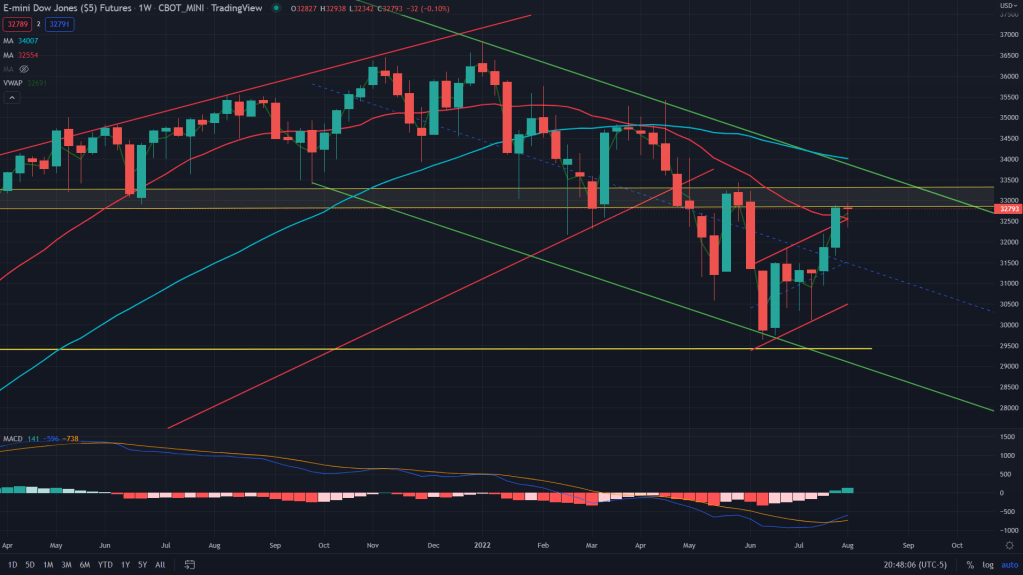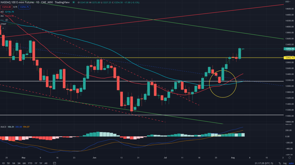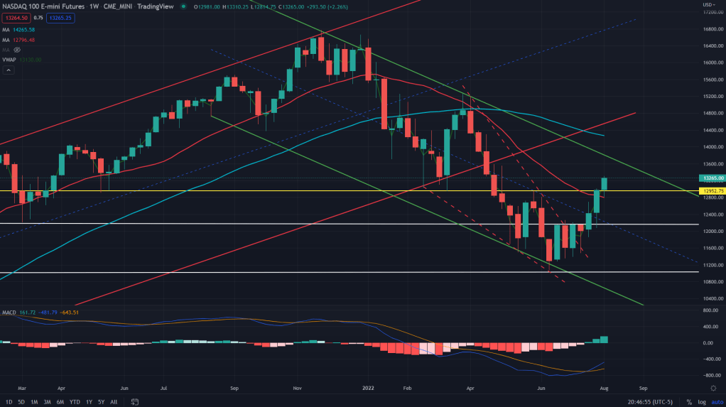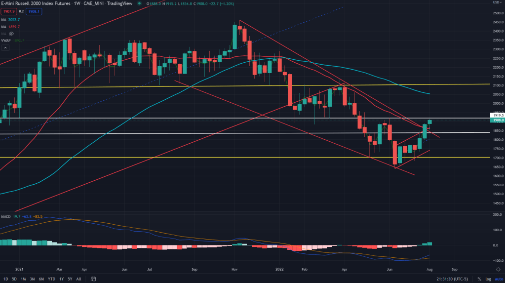NQ (weekly): The tech index future, NQ has been on a tear ever since the Jue bottom, breaking all the barriers one by one – daily and weekly MAs and also now its past the daily supply zone.
