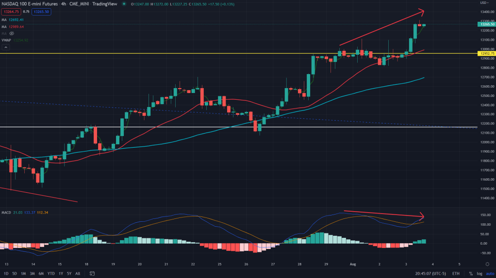 NQ (4H): What can derail or perhaps pause this rally is fading momentum as visible by way of negative MACD divergence in the chart below. 12950 is where I would see NQ to stabilise and resume the uptrend again.