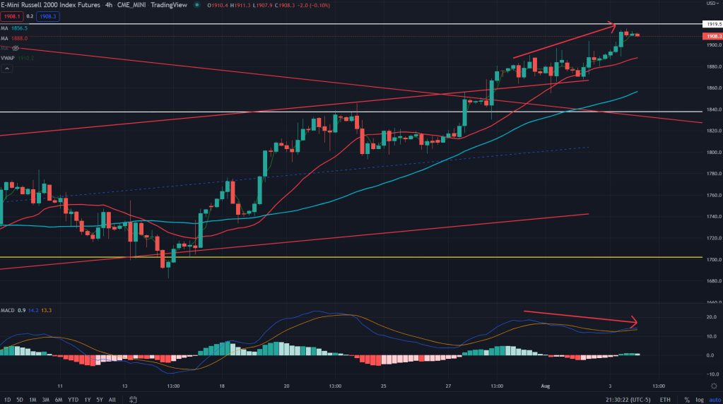 RTY (4H): And the negative divergence on 4H chart. Expect the small cap index to dip towards 1880-65 before resuming its uptrend.