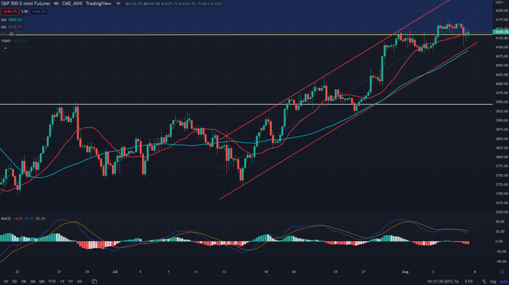 ES (4H): As we mentioned in the last week’s and the mid-week update, the momentum has been dwindling down for the bulls and there is still quite a likelihood for ES to break down of this rising bullish channel, all the way towards that daily demand zone of 3950-60 (just below the 20 SMA, currently at 3980).