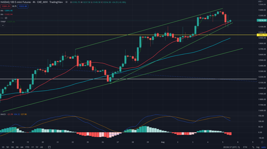 NQ (4H): Same goes with NQ which is sitting just on the cusp of breaking down of the rising wedge, once broken, bears can quickly take it to the weekly demand zone of 12950 and towards another 4H trendline support around 12700, which is where bulls can step in as the trend is still on the upside as shown on the daily chart below.