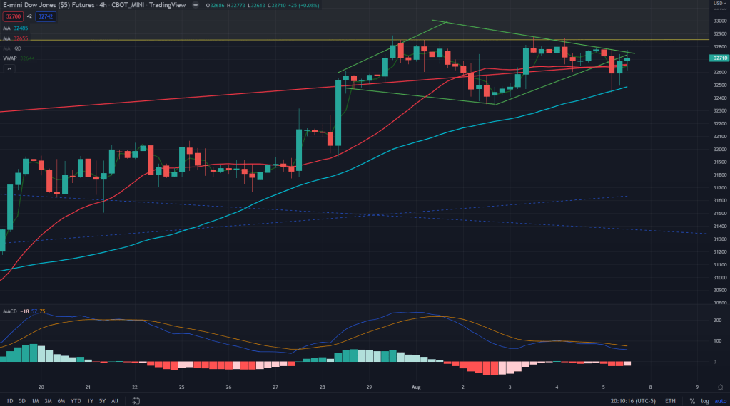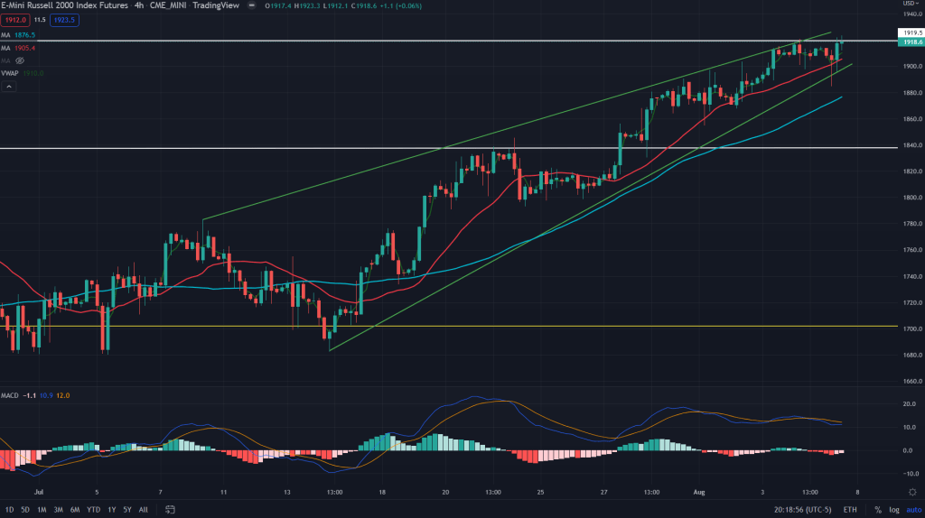 RTY (4H): Rising wedge on the cusp of breaking down here too while momentum too is not on the side of the bulls as depicted by the diverging MACD. I would be seller here too.