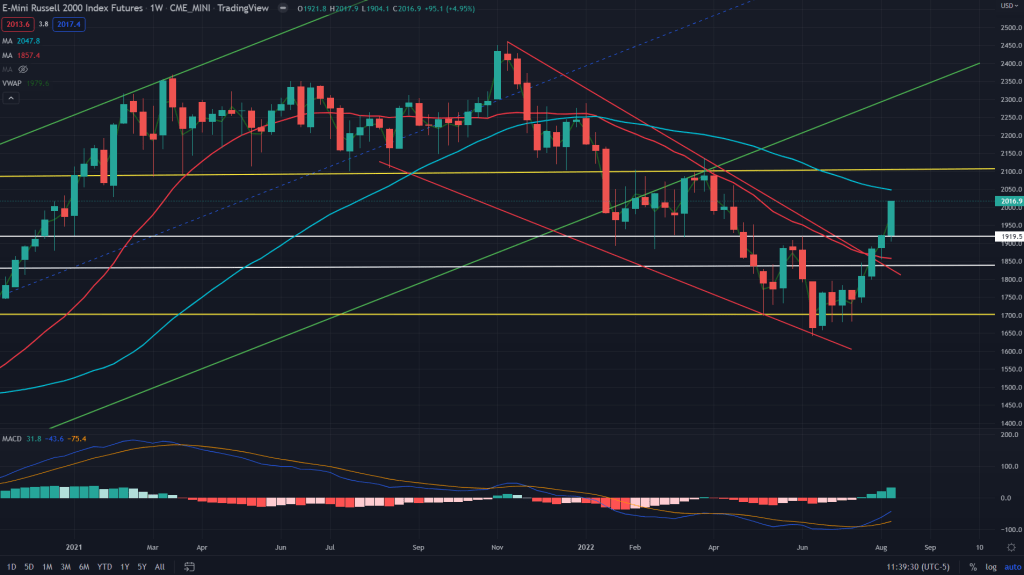 RTY conclusion: Selling between here and the 50 weeks MA and would add more when MACD diverges on the daily, which might take all of August before actual bear market resumes.