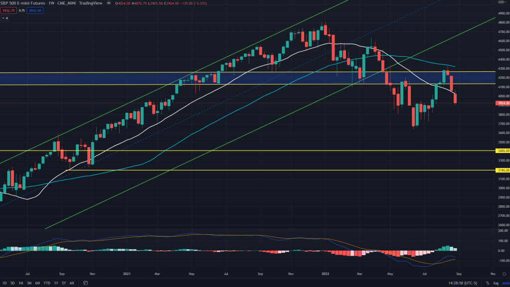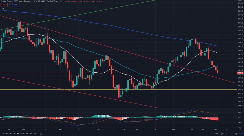 RTY (weekly): The sell-off in RTY has been a bit less severe compared to other key indexes. So far it has only reached the backtest line of the wedge breakout and right at the 4H demand line of 1790 along with rejecting off the 50 days SMA. Expect the weakness to continue.