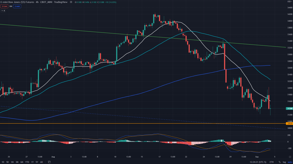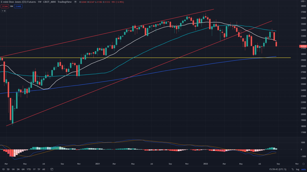 YM (weekly): Similar pattern on the YM as well.. rejected off the weekly 50SMA, daily 50SMA and headed towards 4H demand line of 30939.