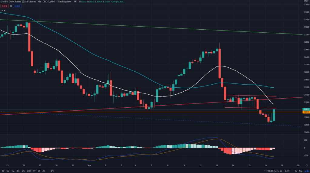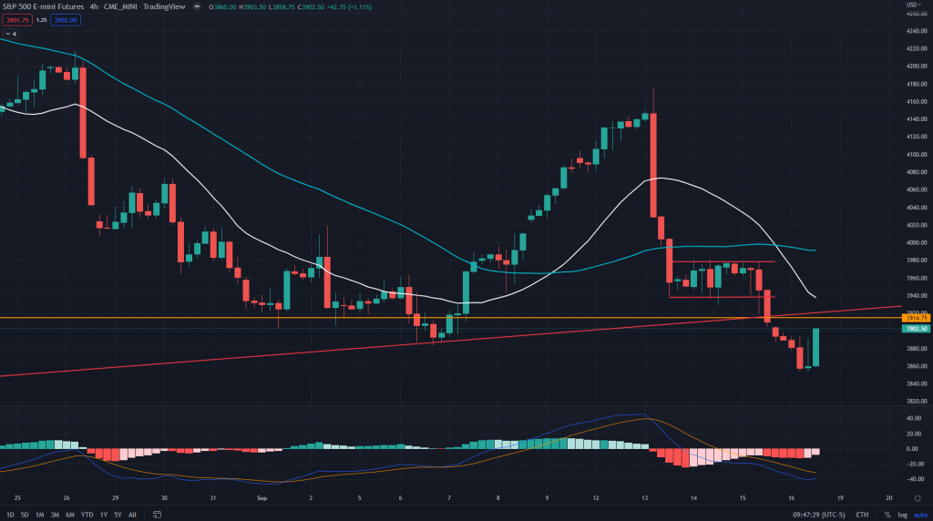 ES (4H): And when we take a look at the 4H, it probably is headed for a backtest of the breakdown of low base trade that we didn’t capitalise on. The chart below clearly shows why we didn’t short on Friday when markets bled while we sat on our hands – 4H demand line of 3915 and support in the form of recent lows’ trendline. Not an ideal place to go short. The low base worked, but it could have gone otherwise too.