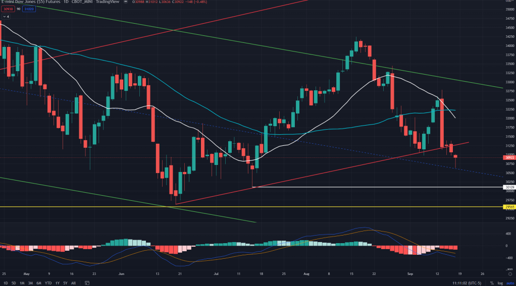 YM conclusion: Perhaps the weakest of the lot and has already backtested the breakdown and may even go all the way towards upper end of the low base, which is at 31350, coinciding with the backtest of trendline support breakdown.