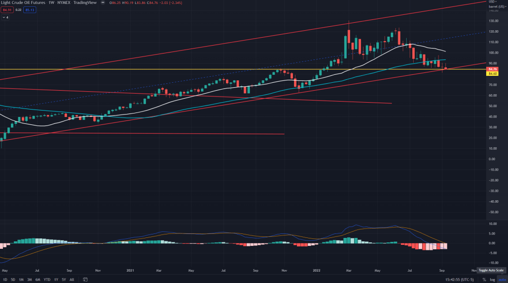 RTY (Weekly): Slightly different story on the RTY – It has now fallen all the way towards its 200 weeks MA and has been flirting with it for the past 3 weeks now. I would expect some bounce here for 3 reasons: weekly 200MA, backtest of falling wedge and..