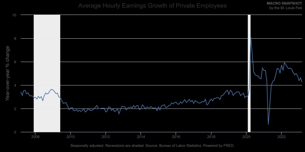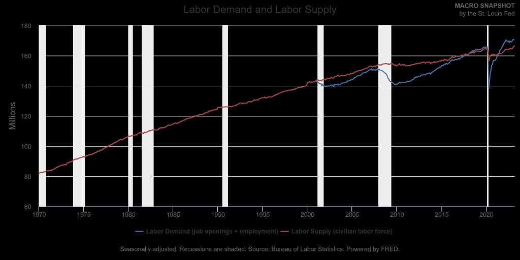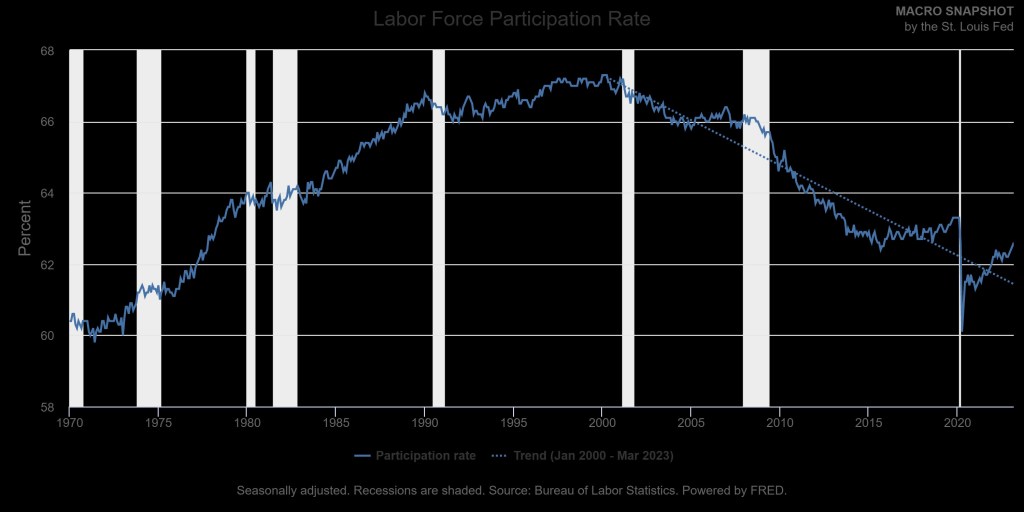 What should one take from this? Although, many market participants would like to be joyous with the fact that inflation is trending lower, but as they say, don’t say over till its over. I wouldn’t be a naysayer, but if inflation had to moderate as much as all the way up to 2 percent, then it would have by now. The longer it takes, the harder it is for the general public to expect it to moderate. It is the ‘used to’ attitude that takes longer to come off. Stickiness of inflation is far more harder to get rid of as against inflation itself and this stickiness is what worries me more and you should be worried too. More so when the labor force participation and the demand supply gap of the labor point us towards inability of the companies to be able to fulfil the vacancies they have. Making it harder for them to higher at lower wage rate, to ensure existing employees stick around. This is very pertinent when we look at the average hourly wage.