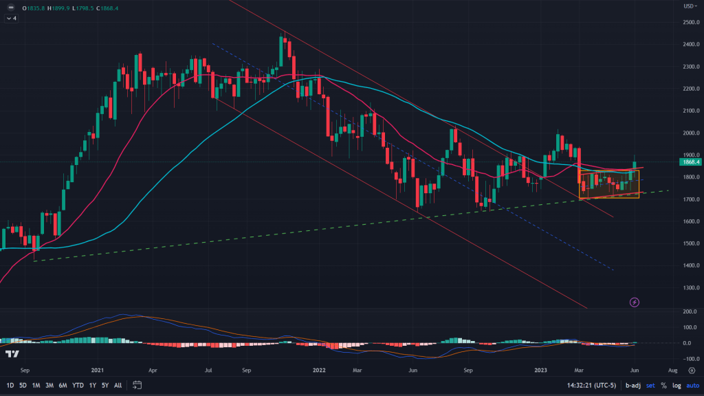 RTY (weekly): RTY was consolidating for a very long time in that low base formation, which is usually a bearish pattern, but has not broken out to the upside and that’s bullish for the small cap index.