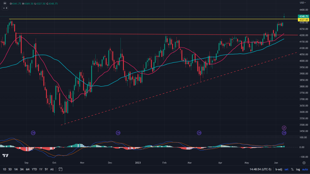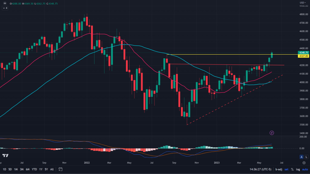 ES (Weekly): ES is on a tear. Last week it broke out of its long awaited 4200 resistance zone (ascending triangle). And in the week gone by, it also broke out of a key weekly supply line of 4327. What’s more interesting is, there hasn’t been a backtest yet, especially for the ascending triangle.