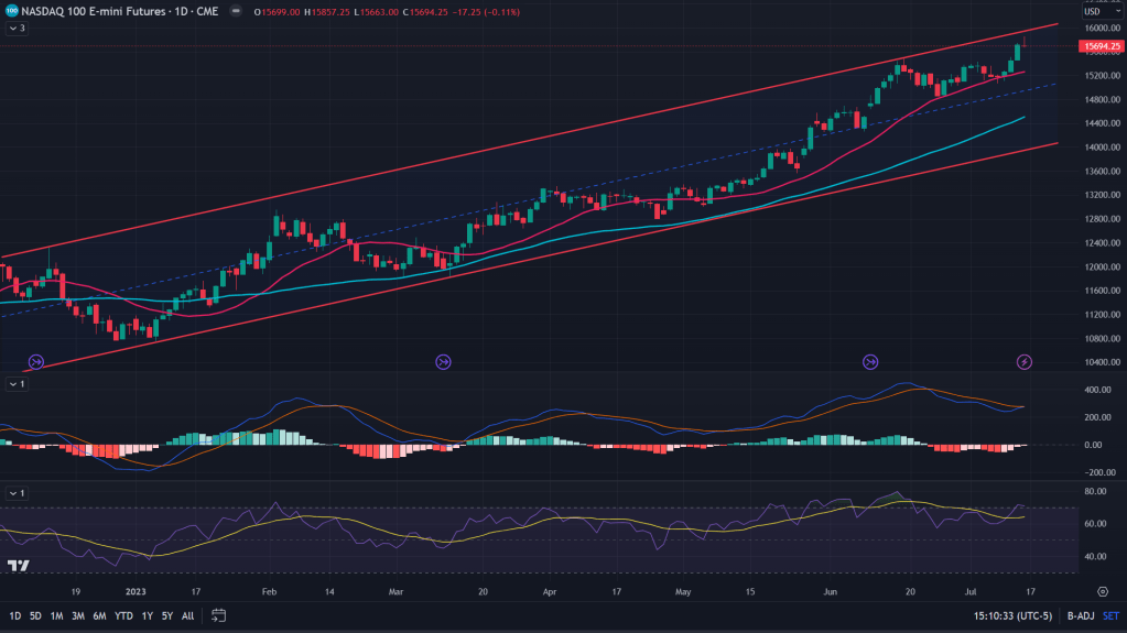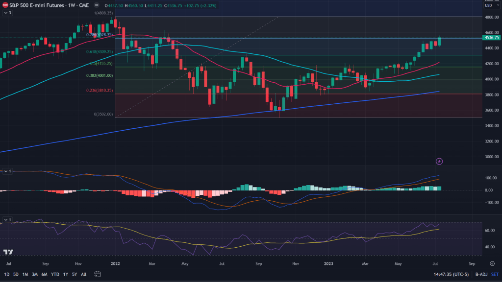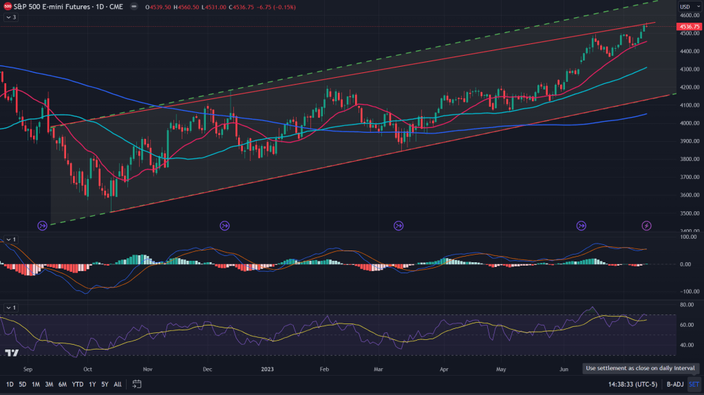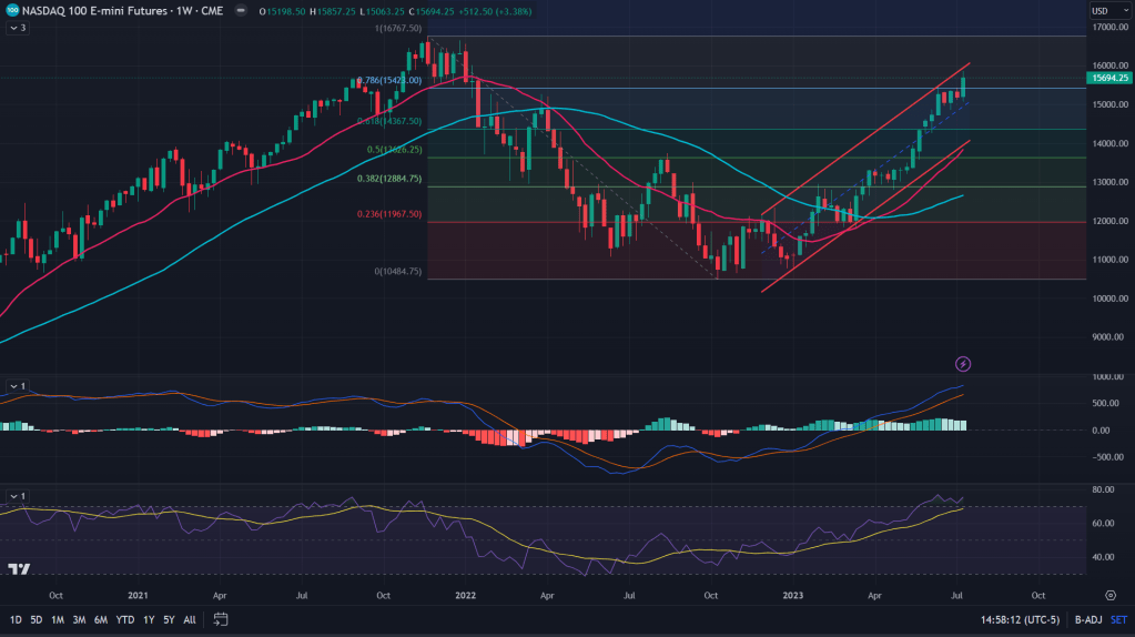 NQ (Weekly): Weekly chart, while comfortably above 78.6% fibonacci levels, it is still lurking under that upper end of the channel while RSI as high as was seen during 2021 mania.