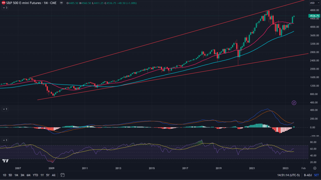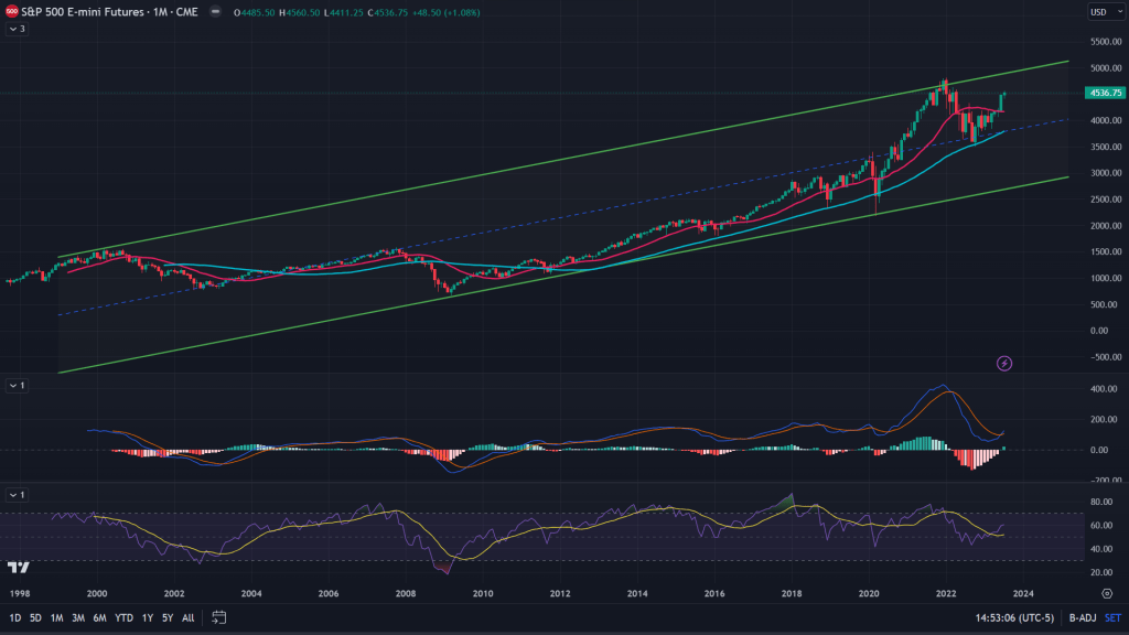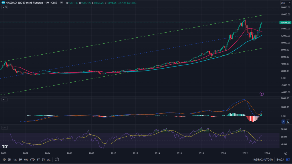 As shown in the megaphone (or expanding triangle) above and the decades long channel below. It does make sense that market tries making a new high in a gradual manner because for both those patterns to complete and then to break down (if any), market need to trade in a pattern that shows topping out of either of those two. As I spoke in last week’s post (read here), for any technical pattern to complete its formation, it involves certain characteristics that needs completion and if these two monthly patterns are to be completed, all it needs is at least revisit of the all time highs.