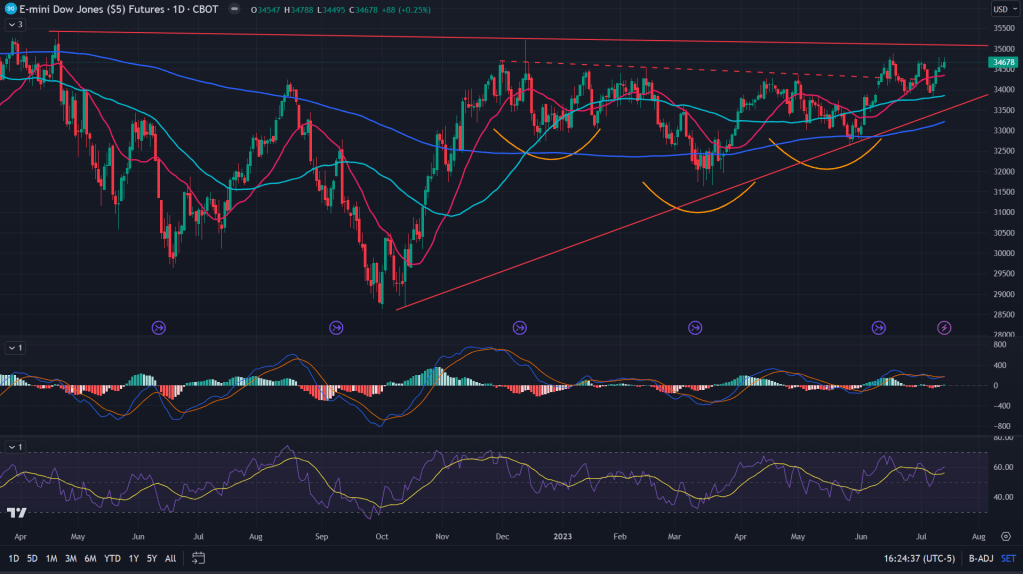 YM (Daily): The only positive? Not only have bulls been able to hold themselves up after that inverse Head and Shoulders breakout, there is a positive momentum to break past that ascending triangle. Although, yes RSI and MACD are diverging negatively. Not healthy!