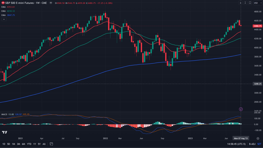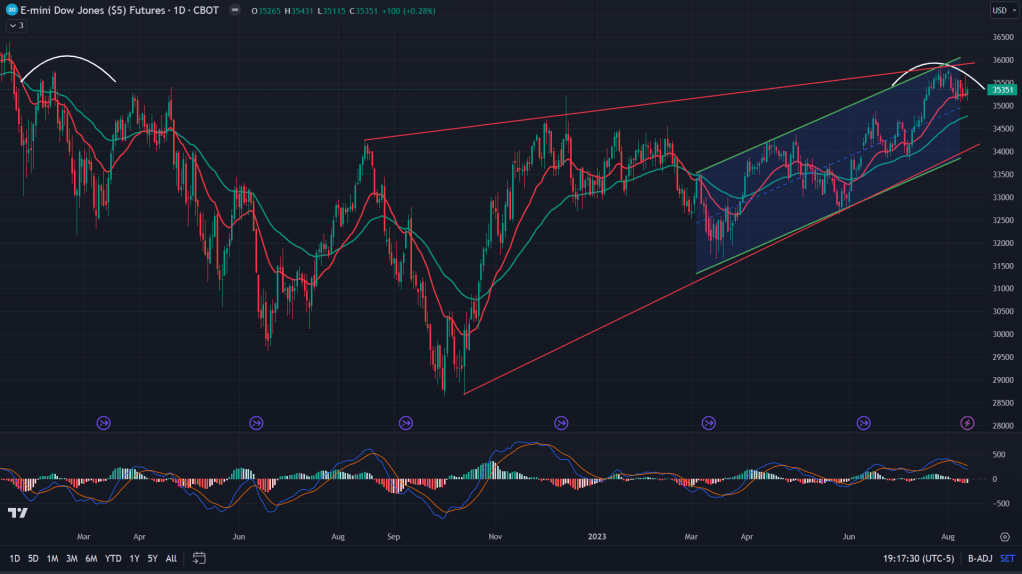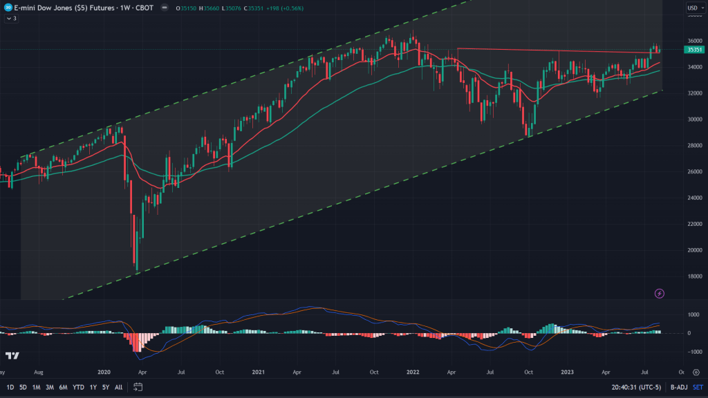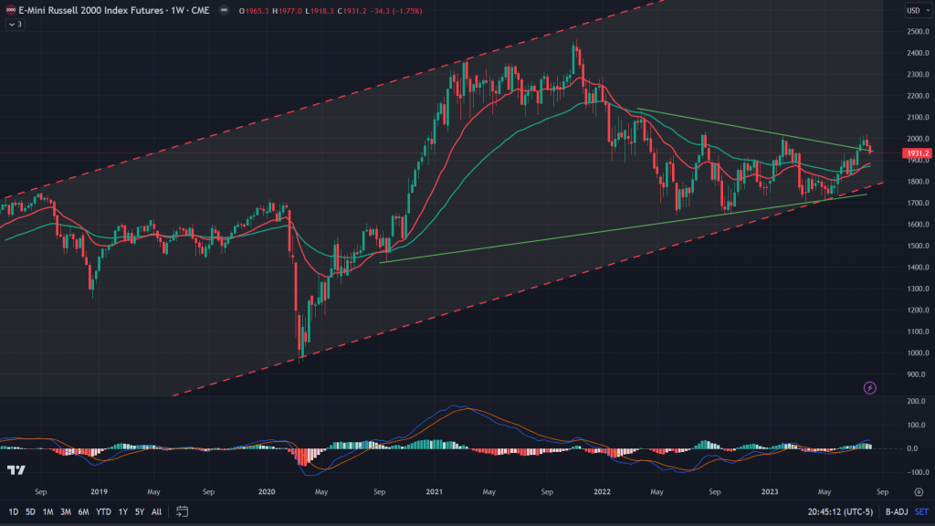 RTY (Weekly): RTY has just fallen under that trendline resistance that it broke out of in its journey up. Challenge for the bulls would be to hold on to 20EMA and cross past this trendline resistance again.
