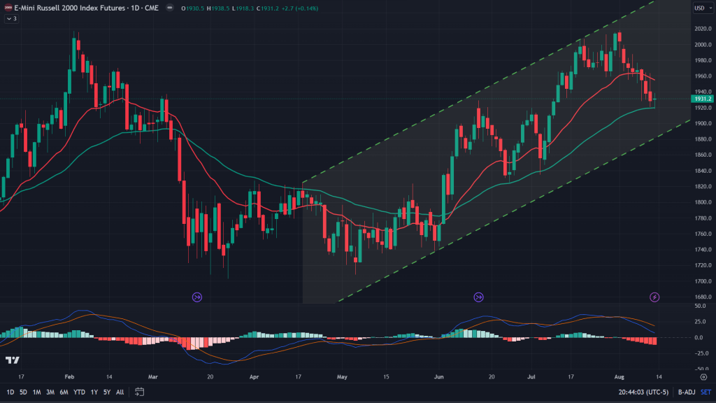 RTY (Daily): 20 EMA gone, 50 EMA barely holding up and Friday’s doji isn’t giving any sign of confidence either.