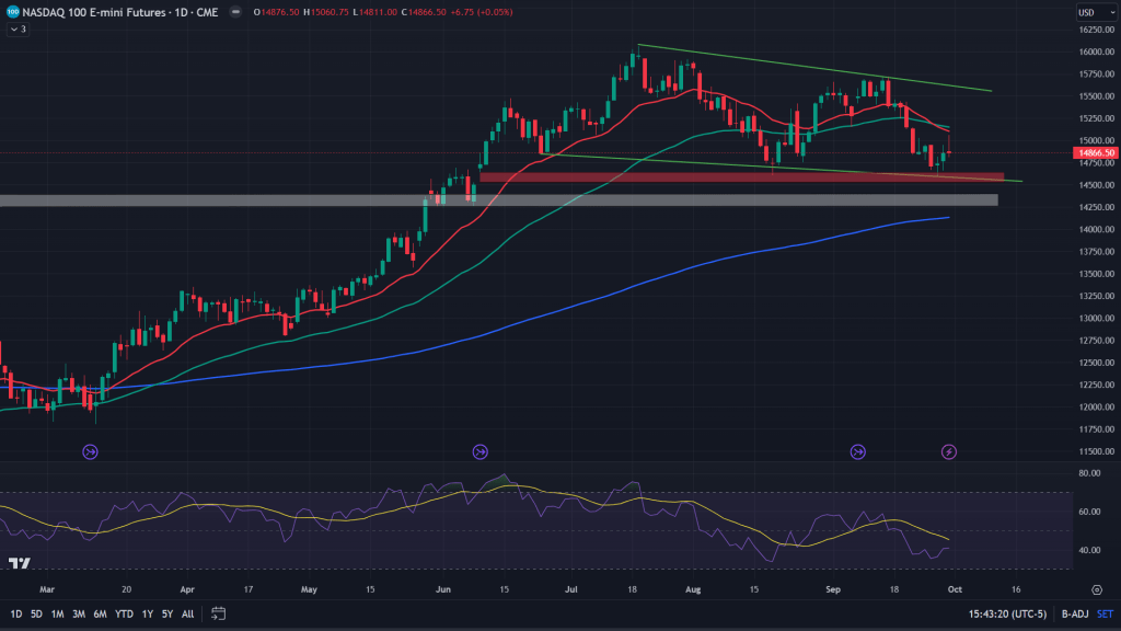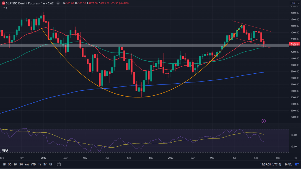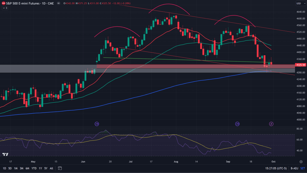 ES (Daily): That Head and Shoulders finally broke down, along with filling that unfilled gap that has long been there. While that gap (red horizontal area) has been filled, the bounce towards the end of the week has been driven by two key things – 200 days EMA and demand zone of 4280-4326.
