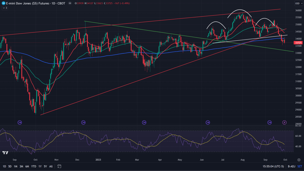 YM (Daily): Head & Shoulders (white) – Broke down! Rising wedge (red) – Broke down! 200 days EMA – Broke down! One wonders how can that ever be bullish? The only simmering hope for the bulls is a trendline support (green line), currently based at 33,000 – psychologically important level to keep an eye on!