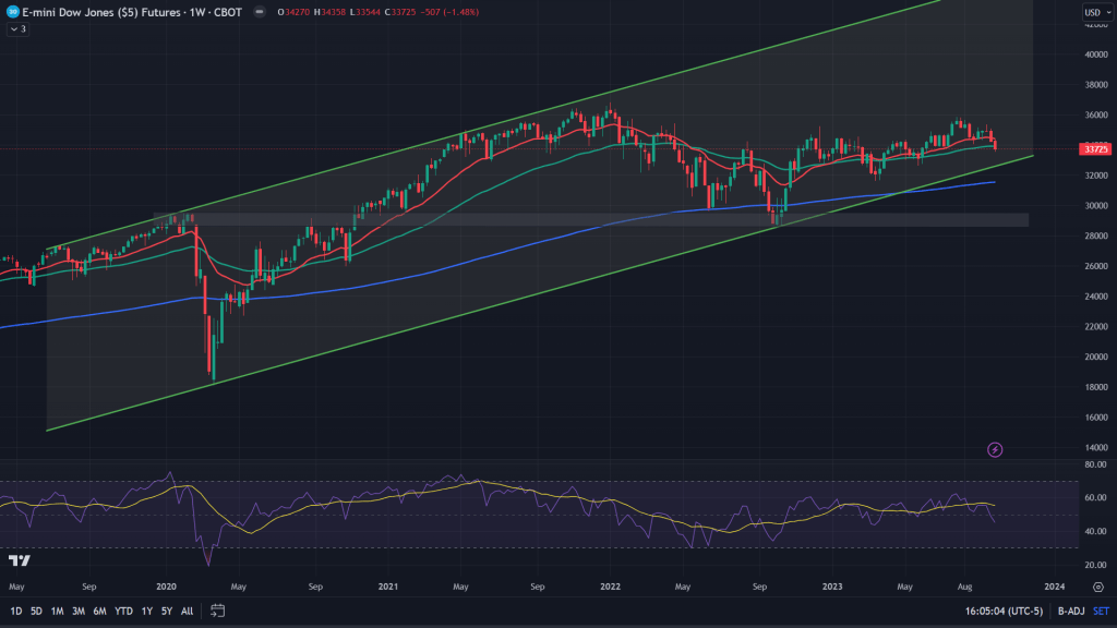 YM (Weekly): YM has been trading inside this weekly channel for a very long time (from covid lows), which seems to be on the verge of a breakdown now, especially when it has given up on the 50 weeks MA already after giving up on 20 weeks EMA in the previous week.