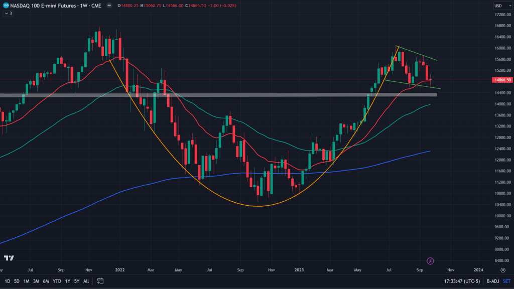 ES (Weekly): I had posted this chart last week on Twitter (See here), this is not my base case given the macro economic picture around us. Because this pattern is extremely bullish when it breaks out. For markets to be so bullish, the macroeconomic environment has to be supportive, which isn’t the case at this point. But, I wonder if macroeconomic developments have ever preceded such a rally? I doubt that has ever been the case. Keeping that in mind, I would still keep my eyes and ears on this chart and keep posting it until it is invalidated. For this chart to get invalidated, ES must close below its 50 weeks EMA, currently at 4263.