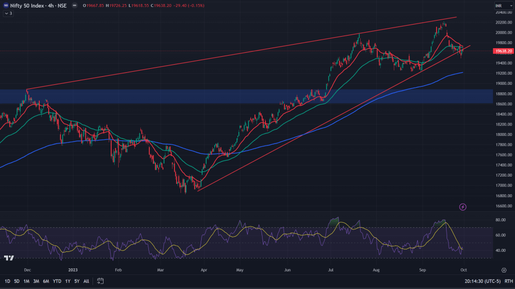 Nifty (4H): What you see here, is almost breakdown of the rising wedge on the 4H chart. While it is still close to the lower end of the wedge, it gives some hopes for the bulls to try and recover. If it continues on this path, one can expect Nifty to head towards 18900-19200.