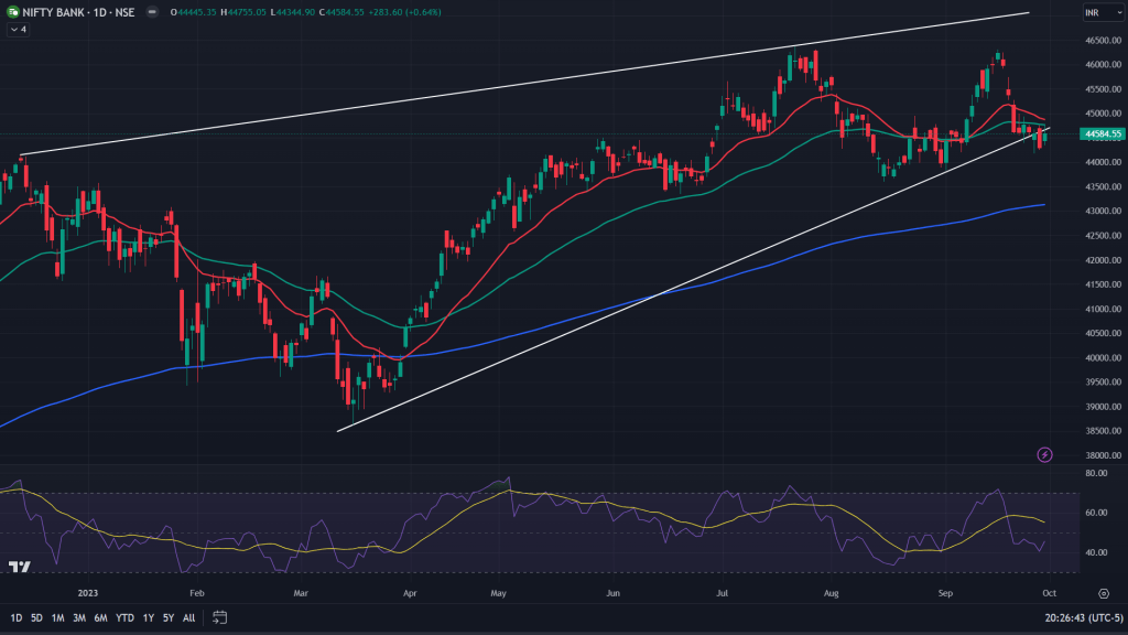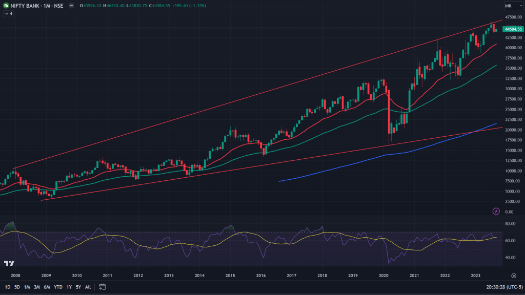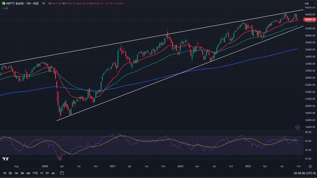 BankNifty (Weekly): If daily was bearish for BankNifty, weekly chart shows that all the more. Reacting from upper end of the weekly rising wedge with a big red candle in the previous week and last week closed with a doji weekly candle close – not a healthy sign at the top and after such a big bearish weekly candle in the previous week and right above 20 weeks EMA.