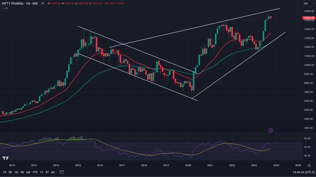 Nifty Pharma (Monthly chart): Monthly chart of Pharma index shows some signs of petering off, although not topped out yet.