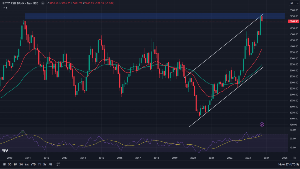 Nifty PSU Bank (Monthly Chart): I had mentioned in the past about the possibility of PSU Bank index topping out around that supply zone. It has reacted exactly there along with forming a double top.