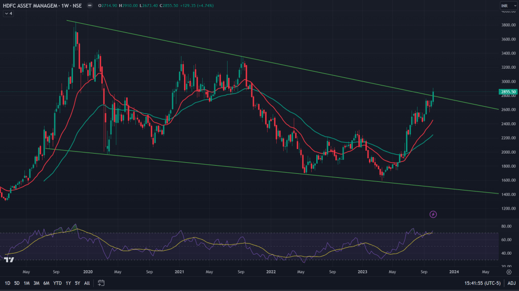 HDFC AMC (Weekly chart): Weekly chart of HDFC AMC has broken out of a 3-years long falling wedge and is bullish for the next few months. Although I would wait for sustenance of this breakout before indulging big time into this.