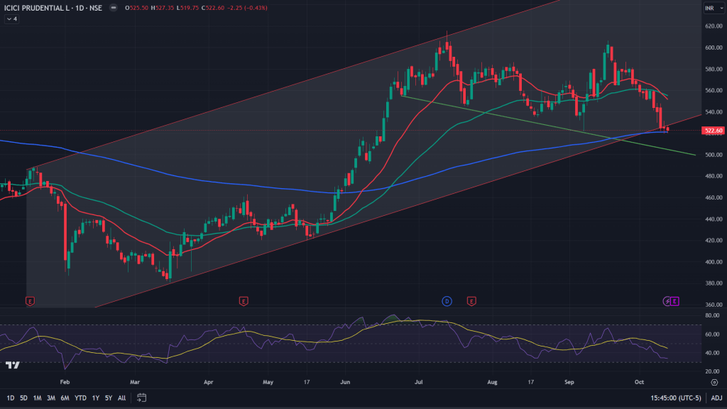 ICICI Prudential Life (Daily chart): ICICI Pru Life, on the other hand has broken down of a year long channel is sitting right underneath of this channel and sitting right above 200 MA. Expect some chop around this zone before decisive action on the downside.