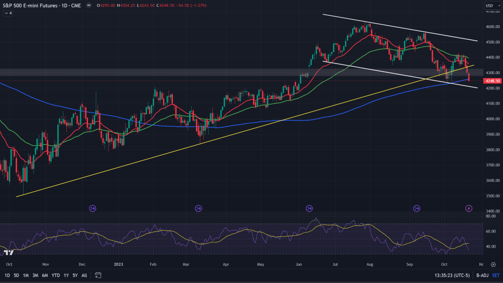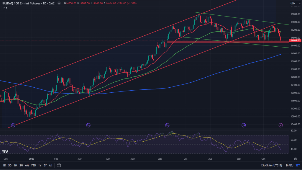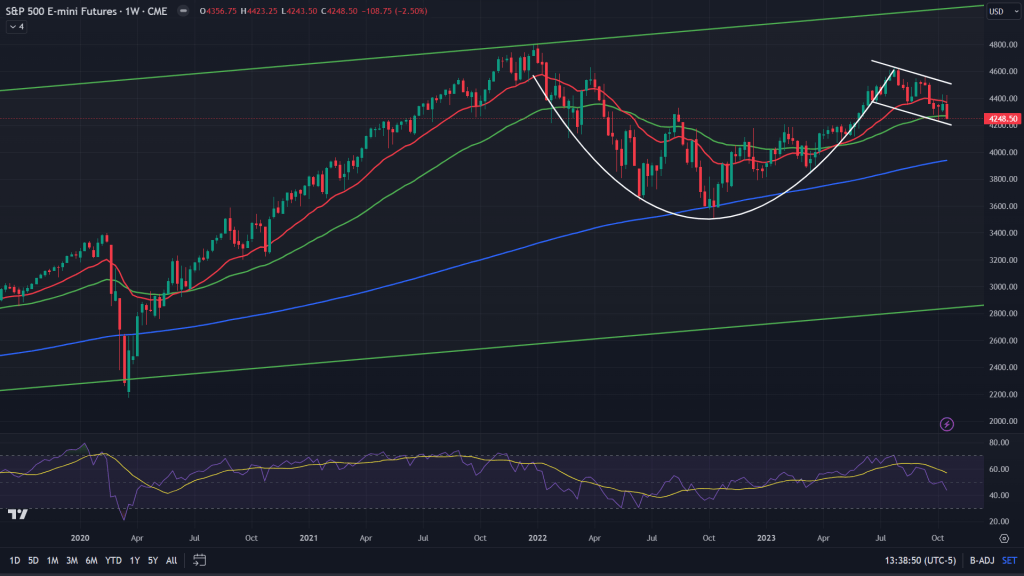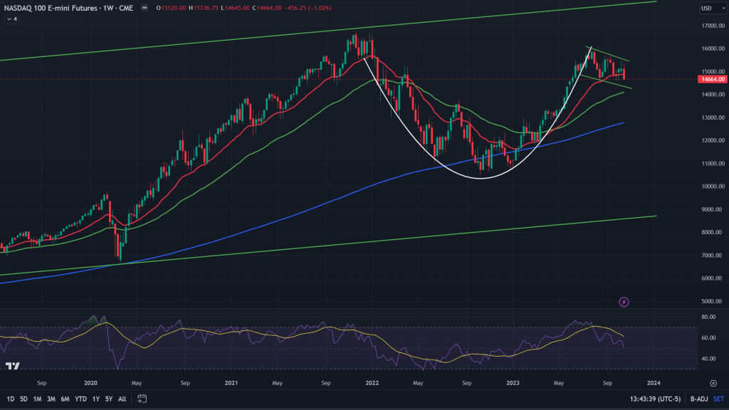 ES (Weekly): When we zoom out to the weekly chart, while the cup and handle pattern is still alive, all the hopes for a major bull run are starting to dim out. 50 MA of the weekly has given up and the channel support of the bull flag (handle of the cup) is right underneath and needs to hold.
