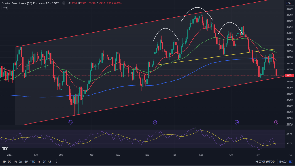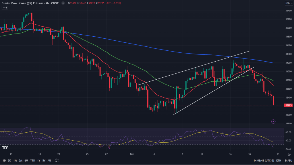 YM (4H): YM has been weak all through this year’s fall and still continues to be so. It broke down off that rising wedge on Wednesday ad now stands close to where it should in terms of attaining that target of the wedge breakdown. RSI reaching its oversold zone too.