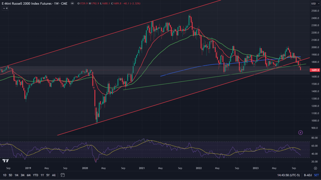 RTY (Weekly): This sharp fall in small caps got only severe because of key channel support, trendline and 200 weeks MA being broken down. The only hope for the bulls is that at some point inside this demand zone, RTY shows some bounce, which would also be helpful in a way because that would result in backtesting the breakdown of those key supports.