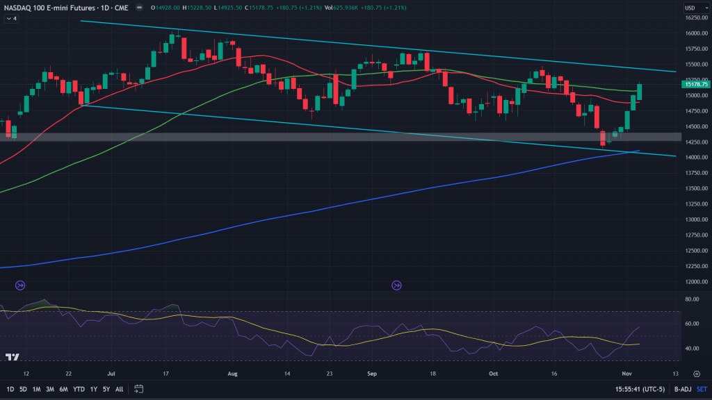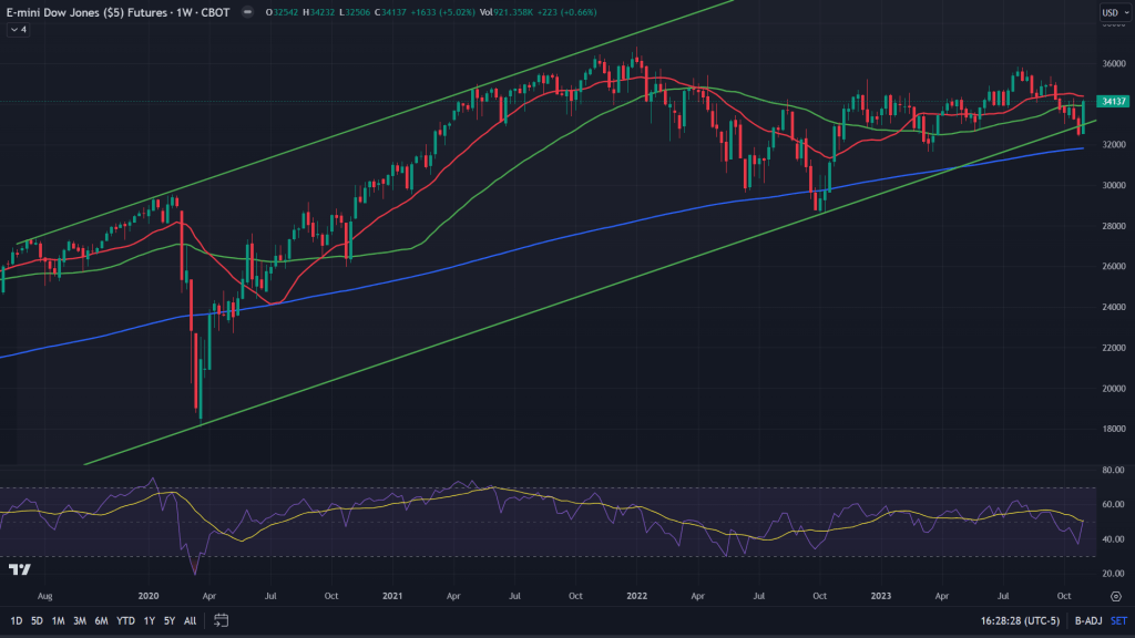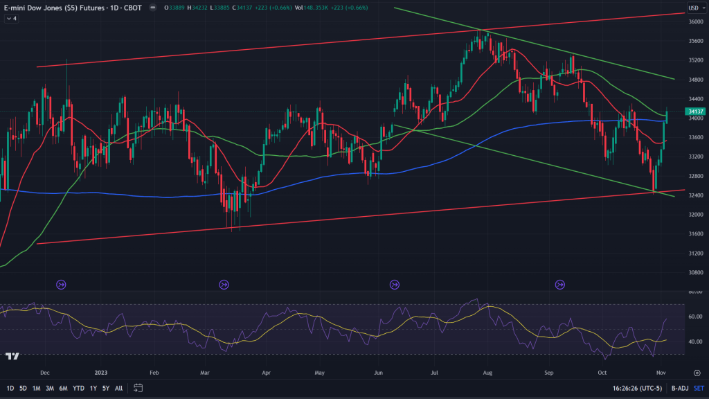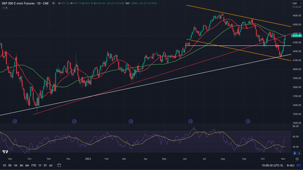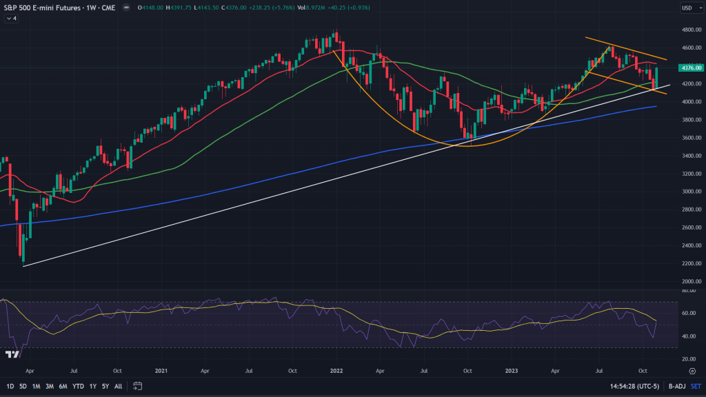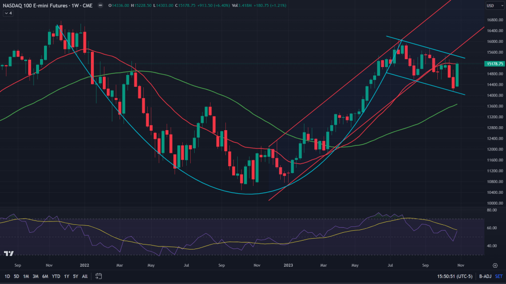 YM (Dow Jones Industrial Average Index 4H chart): Middle of the week (Wednesday), I had posted this on Twitter (or X), that we’re forming inverse H&S on 4H chart on Dow Jones and we should rally further from here (here’s the tweet), that indeed broke out and we continued to rally. But let me be very honest, I did not expect such stupendous rally even after the breakout. The assumption was it should/would stall around 200 MA of the 4H chart and then backtest and then rally again. But there was no backtest. It just continued to rally and in the process Dow too has formed cup like formation on 4H chart, just as ES and NQ have. It has closed Friday at supply zone and I would expect the supply zone to be respected and probably formation of the handle from here. Either in the form of a flag or a base like formation.