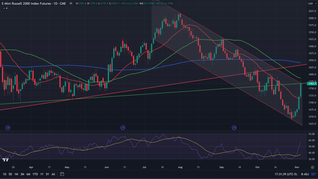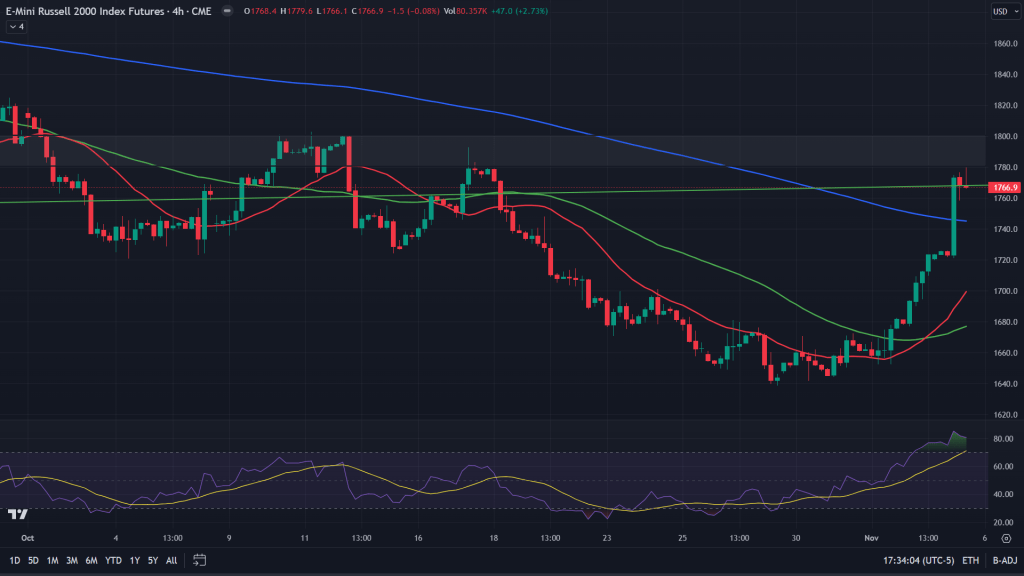 RTY (Russell 2000 Index futures 4H chart): On Tuesday, I had tweeted that the shorts are in danger at this point (read the tweet here), what followed after that is there for everyone to see. Yes, I did expect the rally to continue even after the bottom was formed, all the way upto 1710 and 1740. But it surprised me by rallying even further way to reach almost on the breakout of the channel it has been into during this entire fall. It has now stopped exactly at the 4H supply zone, along with extremely overbought RSI. I would expect some consolidation before it decides to attempt on a breakout.