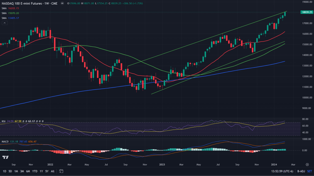 Nasdaq 100 futures (weekly candles): When we zoom out further, the weekly candles does show the price has almost reached a key trendline resistance of this rising wedge of the weekly. Remains to be seen how it reacts here in the coming week.