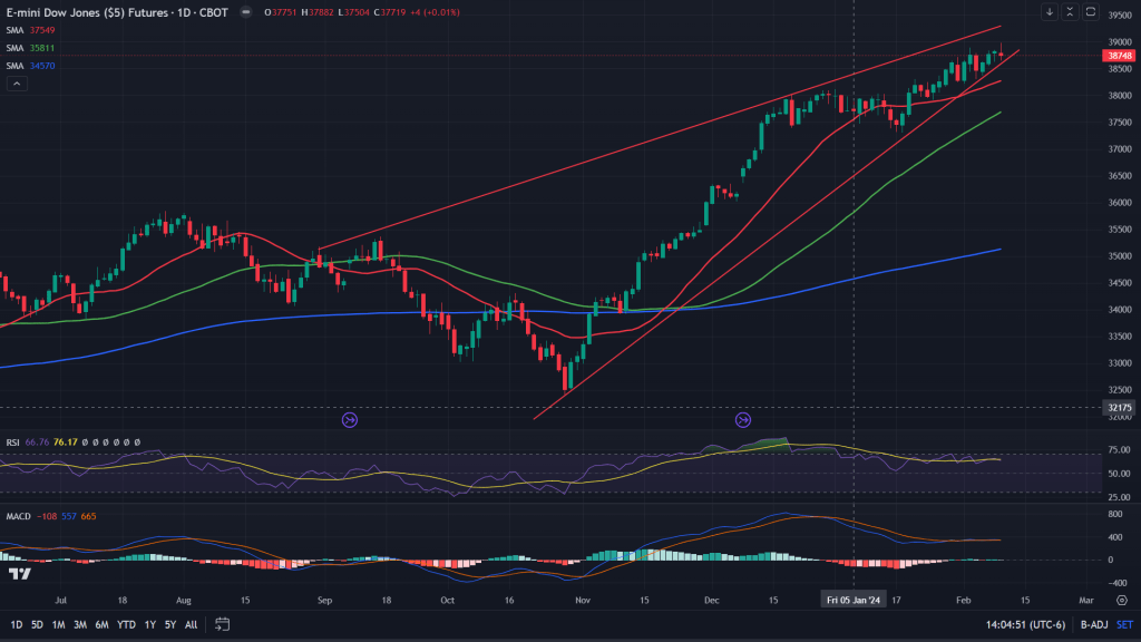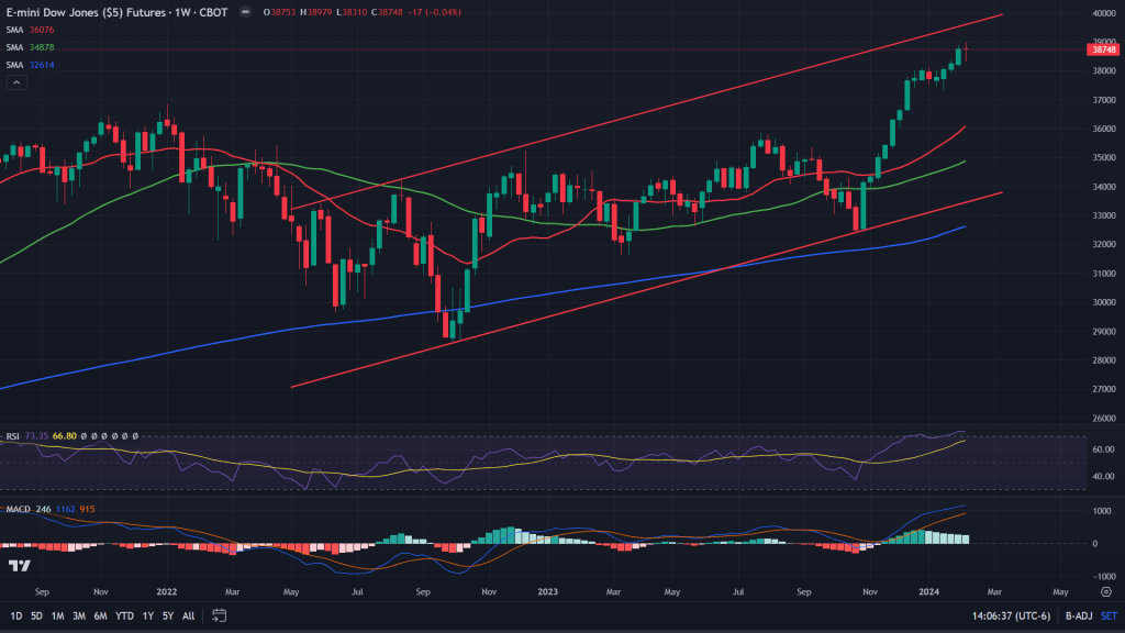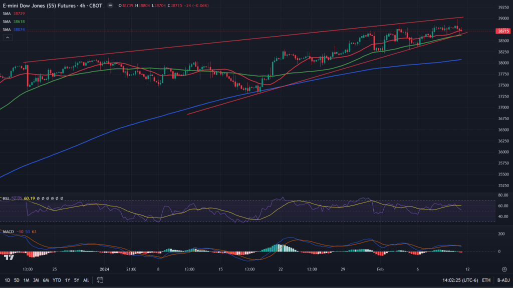 Dow Jones Industrial Average (4H candles): Dow Jones Industrial Average has been a laggard this year and whatever small rally it has seen, was constricted within this rising wedge as seen in the charts below. 4H chart rising wedge is on the verge of breaking down. If it does break down earlier in the week itself, 38260 would be the key support area to look forward to.