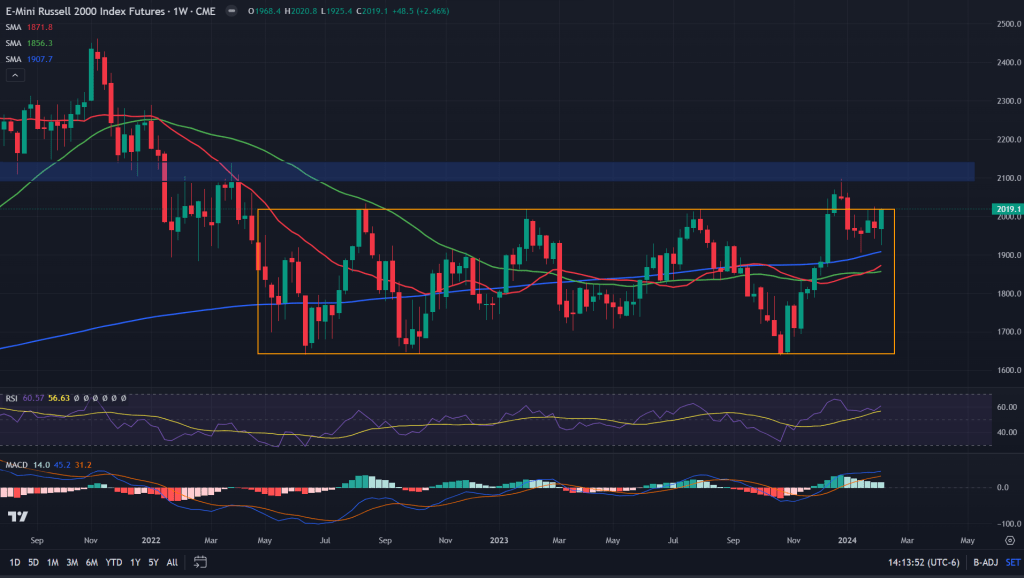 Russell 2000 Small Cap Index futures (weekly candles): At the start of this year, when Russell 2000 gave us a failed breakout, it could have gone down further. But it didn’t. It didn’t even fall past the 20, 50 and 200 weeks MAs. In fact all of the past few weeks of this year, the price has been consolidating above 200 weeks MA and that’s a very healthy sign for the bulls. Expect fireworks in small cap stocks in the coming few weeks if next week’s key data point and the opex support.