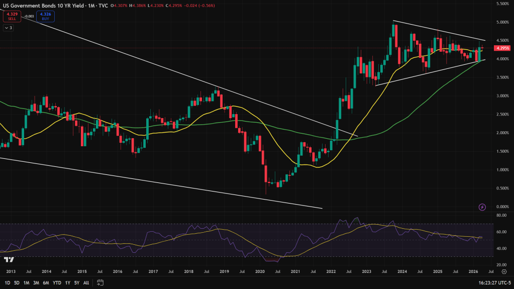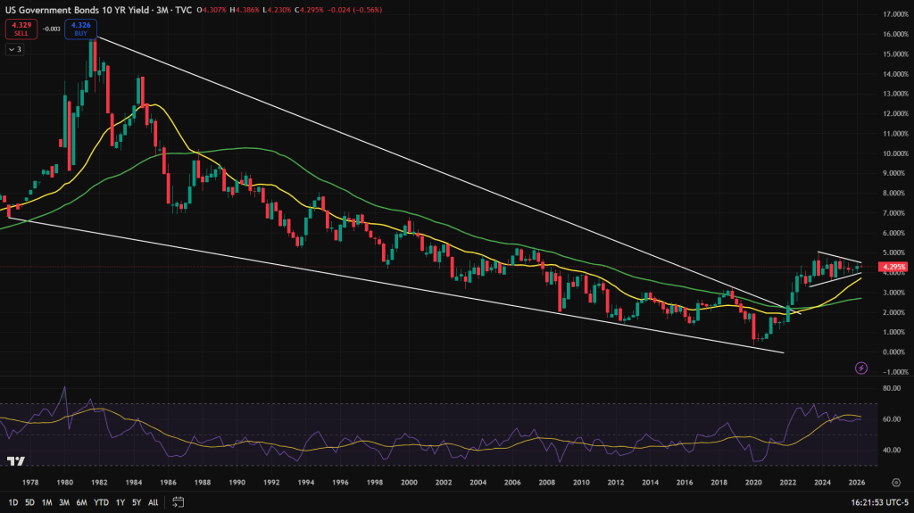 U.S. 10-year Govt Bond Yields – Quarterly candles: But when we zoom out and look at the quarterly charts, 10-year had broken out of a long term falling wedge in 2022 and current consolidation is nothing but a breather of that breakout.